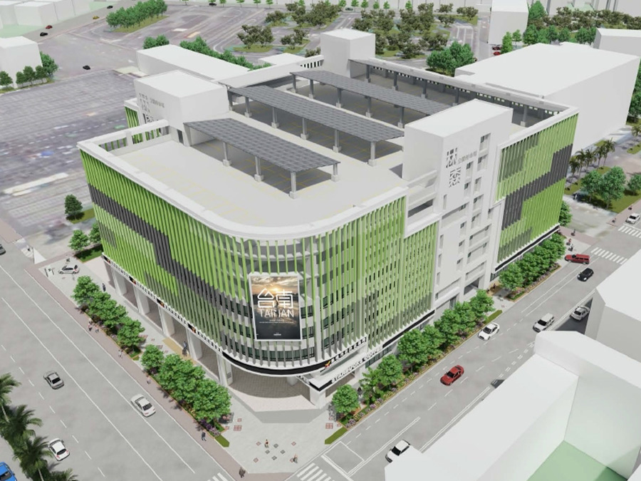 東區林森多目標立體停車場位於台南監理站內,鄰近三角公園、住宅區及行政機關,立體停車場外觀以格柵設計串聯南北向綠色軸帶,並留設通透的街角空間與友善的人行步道環境,將停車場與環境景觀有效的整合。