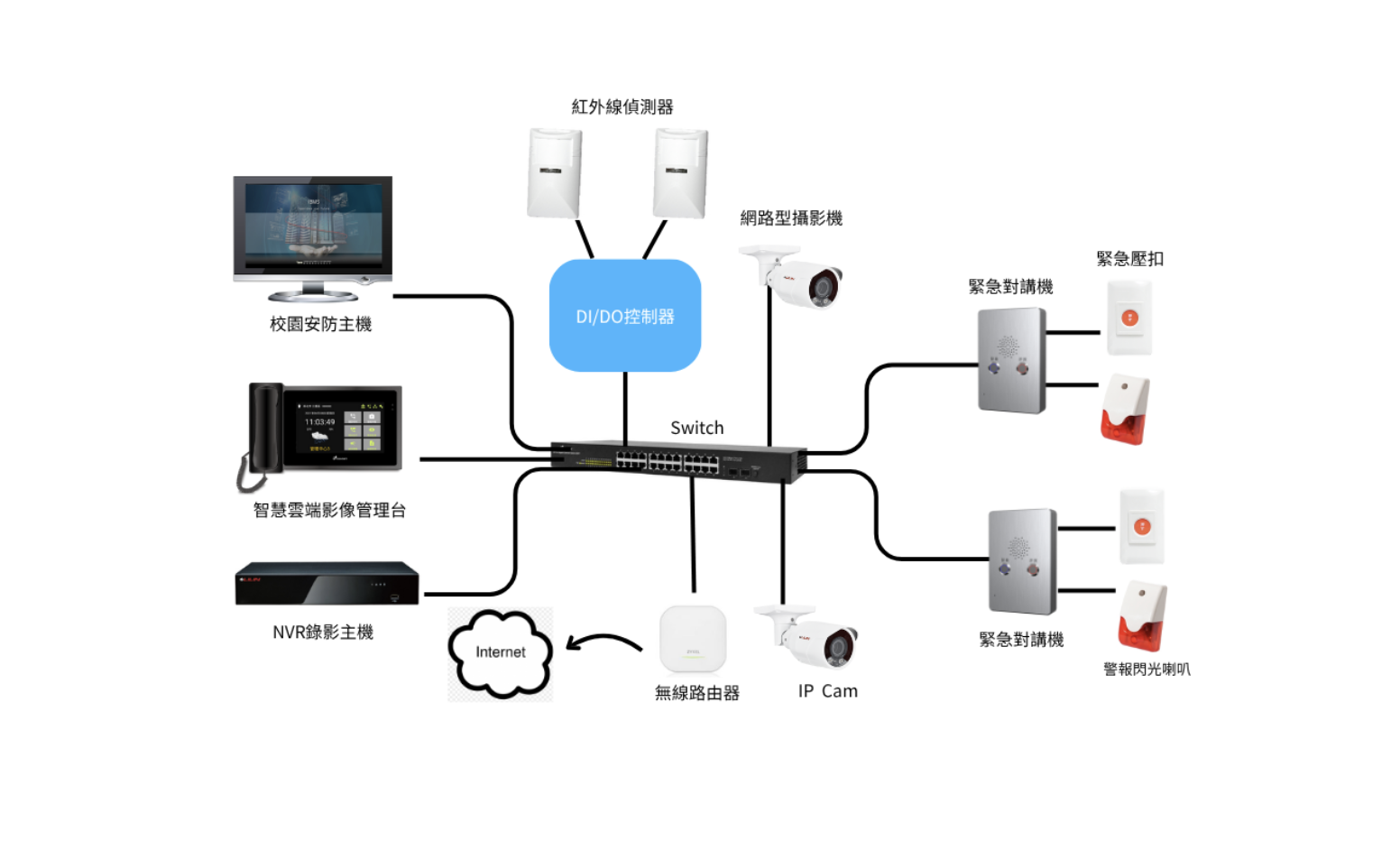 緊急求救對講系統整合語音通訊、警報通知、視訊監控與定位追蹤等子系統,透過 IP 網路與無線網路連接,搭配物聯網感測器及雲端管理平台,實現即時通訊、遠端管理及自動警示功能。可應對多種緊急情境,有效縮短反應時間並提升安全管理效率。